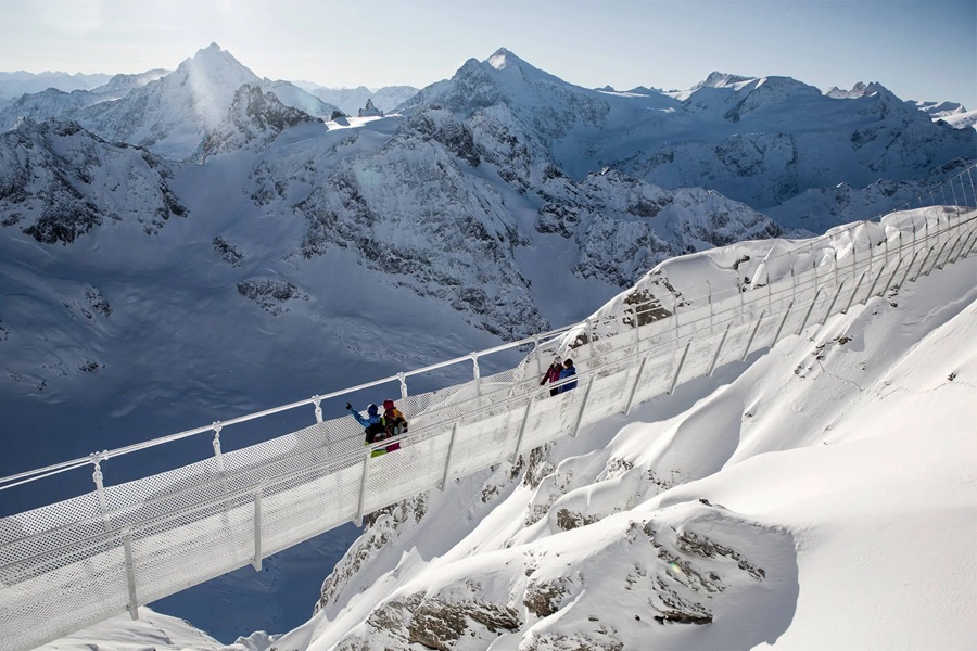 Titlis Cliff Walk, en el Monte Titlis, Suiza, es un puente colgante alpino a 3,041 metros de altitud, con 100 metros de longitud y 500 metros de caída al vacío glaciar. Construido en 2012, su estrechez de 1 metro amplifica el vértigo.